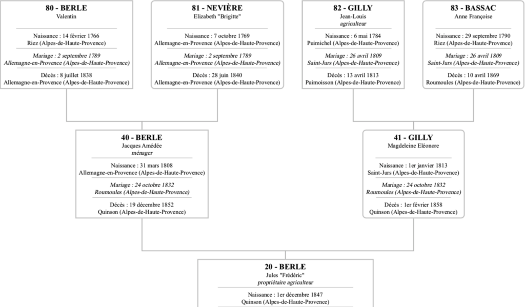 Jacques Amédée, dit Aimé, Berle Sosa 40 est né le 31 mars 1808 à Allemagne-en-Provence. Magdeleine Éléonore Gilly Sosa 41 est née le 1er janvier 1813 à Saint-Jurs, une vingtaine de kilomètre plus haut en remontant le Colostre en direction de sa source.